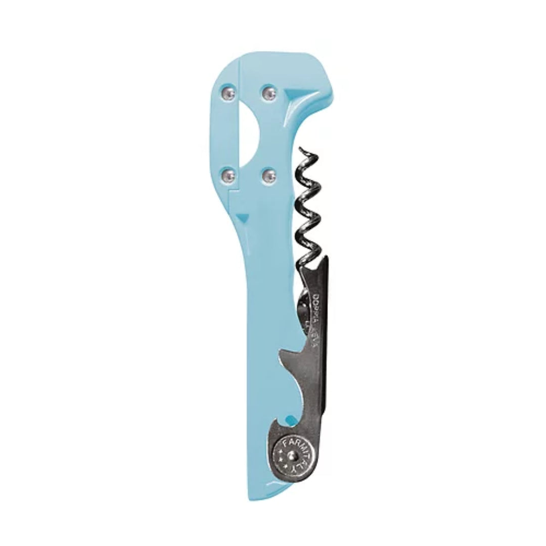 Diseñado y fabricado en Italia por Pulltap's®, este sacacorchos profesional destaca por su sistema de doble palanca que permite extraer corchos con un mínimo esfuerzo, sin dañarlos y en segundos. Su llamativo mango ergonómico en color celeste no solo facilita su localización en ambientes de poca luz, sino que también le da un toque moderno y distintivo a tu kit de accesorios vinícolas.